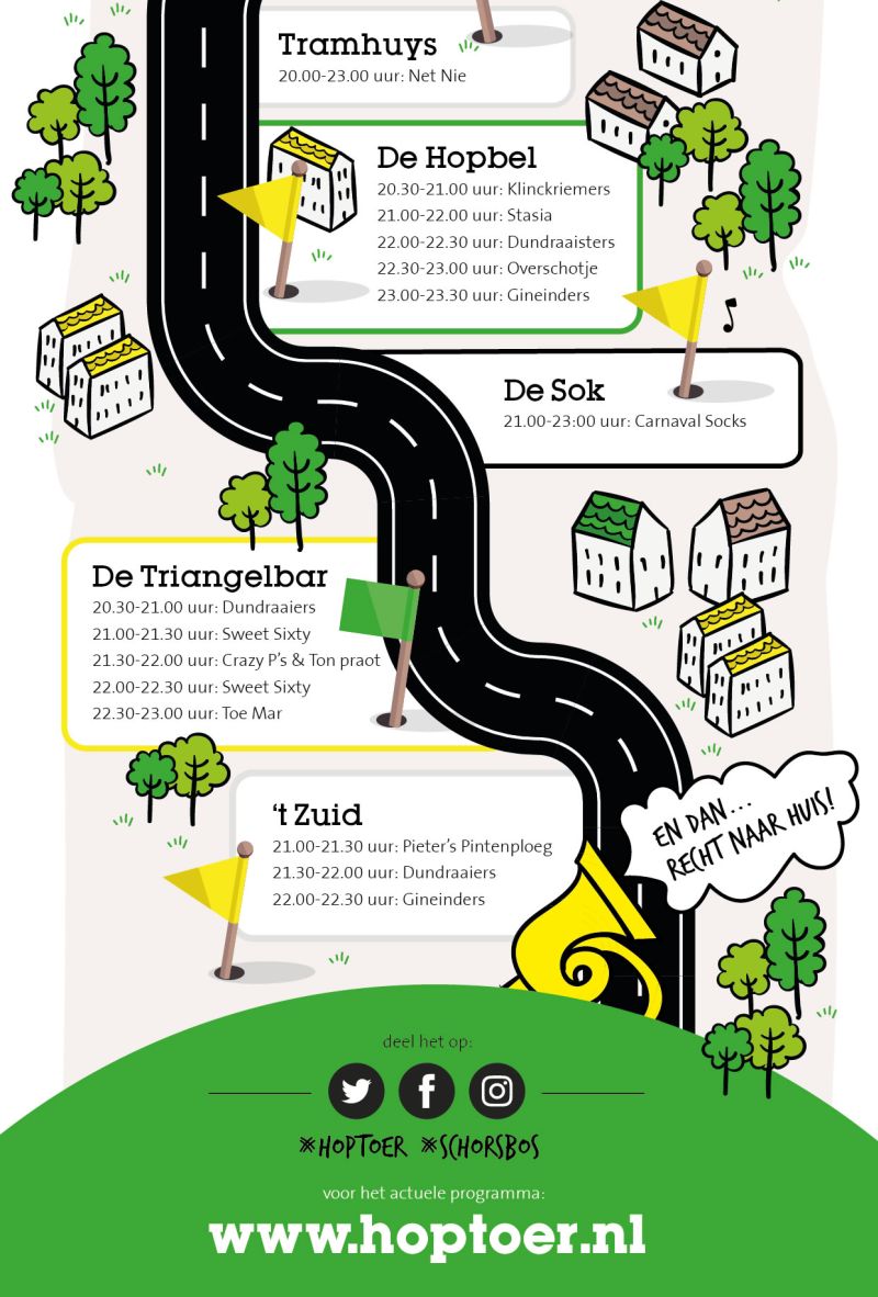 Schorsbos - Zaterdag 8 februari aanstaande is het weer zover, de Hoptoer. Vanaf 20.00 uur start die avond het programma en tot 23.30 uur zal er gratis genoten kunnen worden van band- en kapelmuziek, zang, dans, cabaret, tonpraat en speciale optredens die onder geen enkele noemer vallen. De avond begint met een carnavalesk programma voor de bewoners van het Bekkershuis, de rest van de avond kun je vrij binnenlopen bij de HeerenMeester, de Holy Cow, het Tramhuys, de Hopbel, de Sok, de Triangelbar en ’t Zuid en de Wedding Chapel van Net Nie. Ons advies is om overal even geweest te zijn. Op ons programma hebben we al aangegeven dat de Wijnbar dit jaar helaas niet mee kan doen. Veel spektakel was er vorig jaar bij slagerij van Rooij, waar Net Nie met een fantastische act voor één avond hun schla-la-la-gerij hebben gerund. We vertellen nog niet waar je deze creatieve club dit jaar tegen kunt komen, maar je mag er rustig vanuit gaan dat spektakel weer verzekerd is voor iedereen die zich op 8 februari van kroeg naar kroeg zal bewegen. De Hoptoer, iets aparts en een goeie reden om te veld te gaan. Voor het actuele programma zie Hoptoer.nl