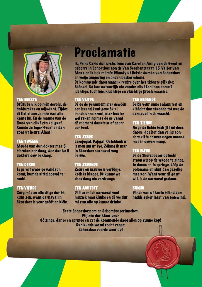 Schorsbos - Ik, Prins Carlo dun urste, inne van Karel en Anny van de Greef en geborre in Schorsbos aon de Van Berghenstraat 15. Vajjer van Mexx en ik hok mi mѐn Mandy ut liefste durske van Schorsbos en weije umgeving en onzen beskermhond. De kommende daog máág ik regére over het skônste plѐkske: Skѐndel. Dѐ kan natuurlijk nie zonder elluf (en inne bonus) luchtige, tuchtige, kluchtige en vluchtige proclemaasies. (De elluf proclemaasjes zijn te lezen onder 'lees meer')