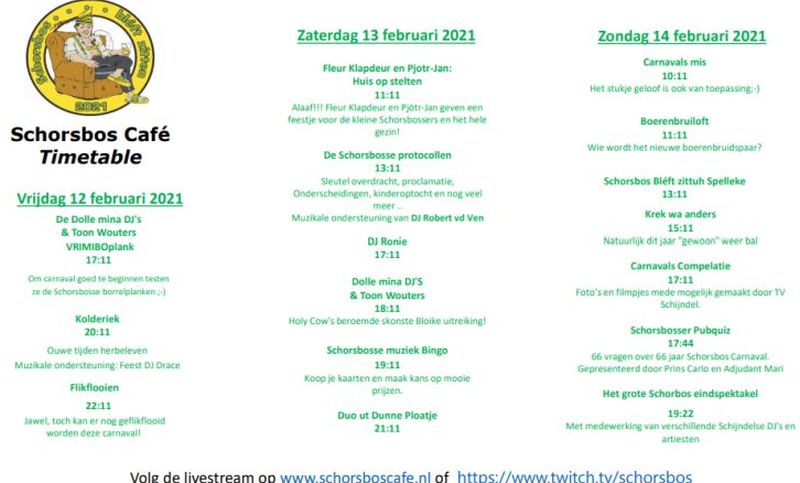Schorsbos - Dit jaar gaan we carnaval anders vieren. Helaas niet live, maar wel via een livestream, zodat je carnaval toch een beetje kunt beleven. Deze livestream gaat van start tussen vrijdag 12 februari 20.11 uur en eindigt op zondag 14 februari om 23.11 uur. Je kunt deze live volgen op TVSchijndel via deze speciale livestreampagina!