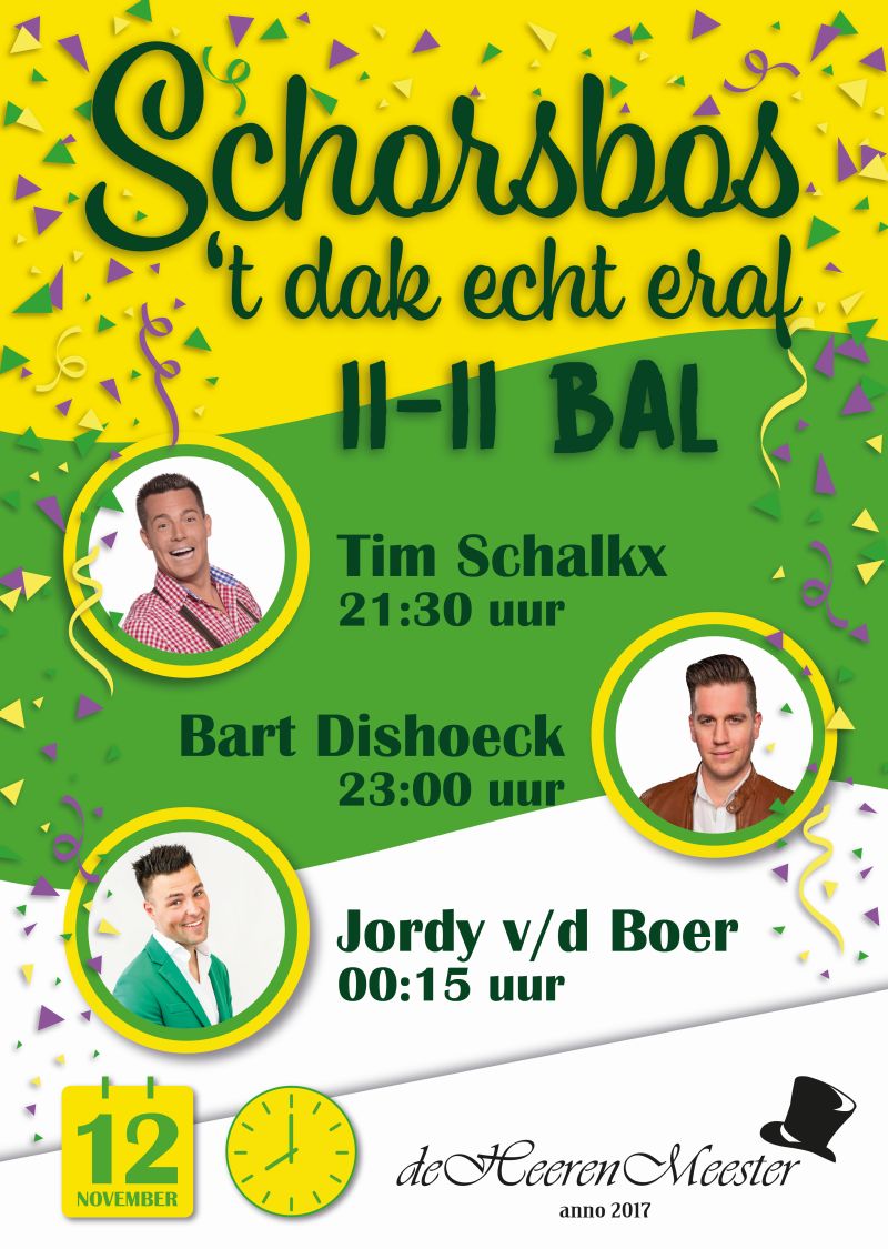 Het 11-11 bal zal dit jaar gevierd worden op 12 november vanaf 20:00 uur in de HeerenMeester aan de Boschweg. Deze avond zal muzikaal begeleid worden door DJ John en DJ Robbert en wordt de muziek van de hofkapel ook ten gehore gebracht. Ook zal deze avond de nieuwe burgemeester van Schorsbos en de ‘moeder van de carnaval’ bekend gemaakt worden en wordt er bekend gemaakt wat het nieuwe embleem van 'Schorsbos ut dak er echt vanaf' zal zijn. Hiervoor heeft iedereen een ontwerp in kunnen sturen.