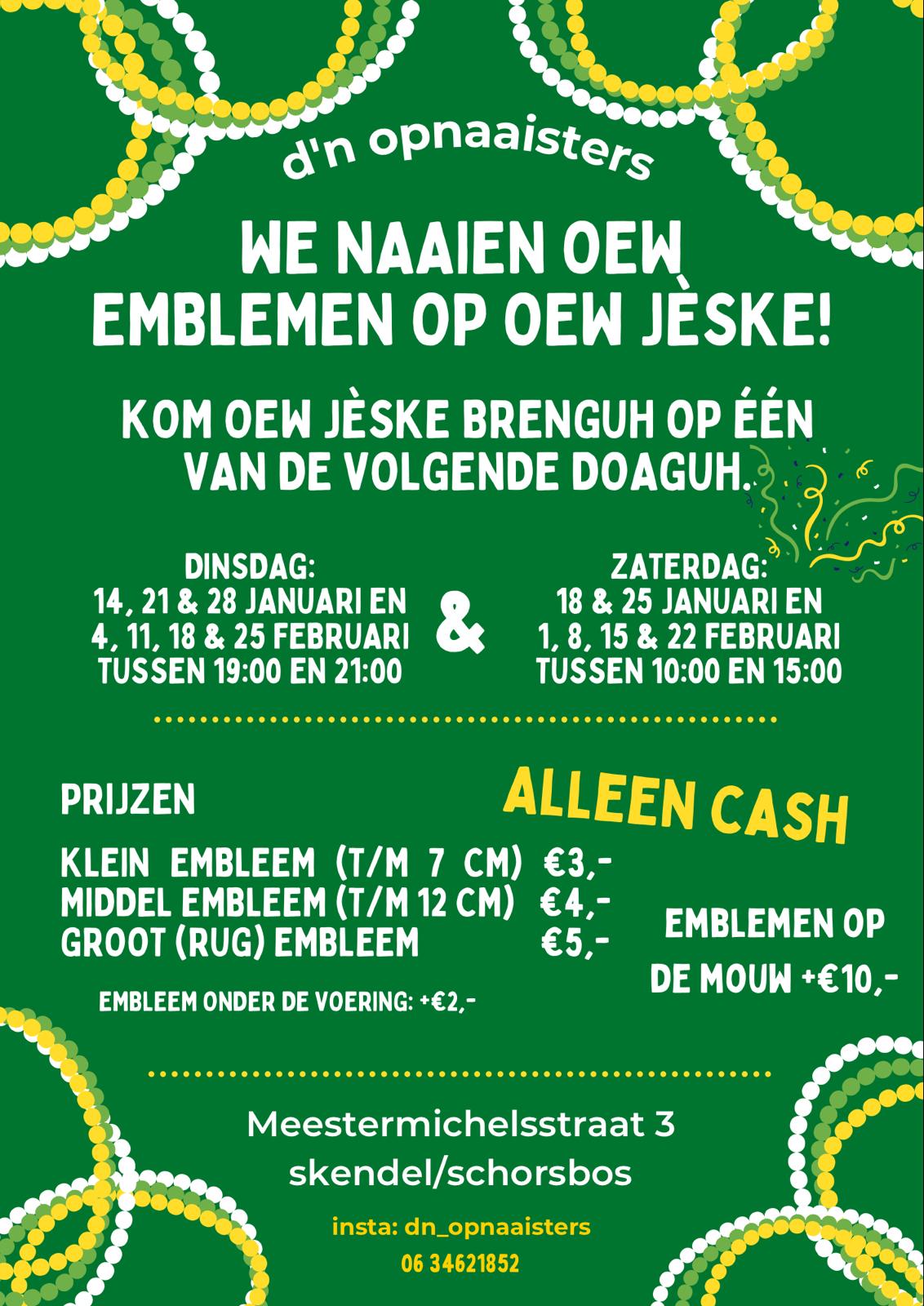 Schorsbos - Is oew jeske vur Schorsbos toe aon (nieuwe) emblemen? Dan helpuh d'n Opnaaisters oe gere verder! Vanaf dinsdag 14 januari kan je op verschillende data je carnavaleske jasje laten 'opnaaien' door 'd'n opnaaisters.