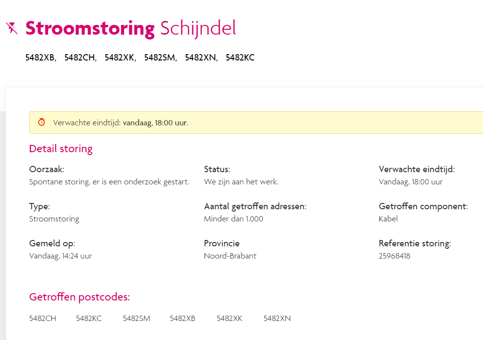 Schijndel - Sinds half drie is er een stroomstoring in de Hoevenbraak en Hulzebraak. Uit onder andere de straten Willem van Oranjelaan en Pluto kregen we berichten over uitgevallen stroom. Ook op de Noorderkroon en Tweelingen zou geen stroom zijn.