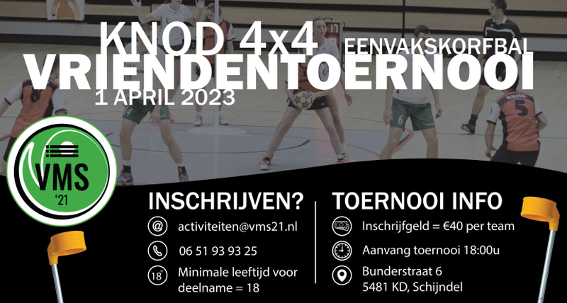 Schijndel - Dit jaar organiseert VMS'21 opnieuw het korfbal vriendentoernooi. Er hebben zich tot nu toe 15 teams ingeschreven maar ze verwachten er nog zeker 10 bij. De wedstrijden vinden plaats op 1 april en starten om 18:00 uur, de finales zullen omstreeks 21:30 uur gespeeld worden