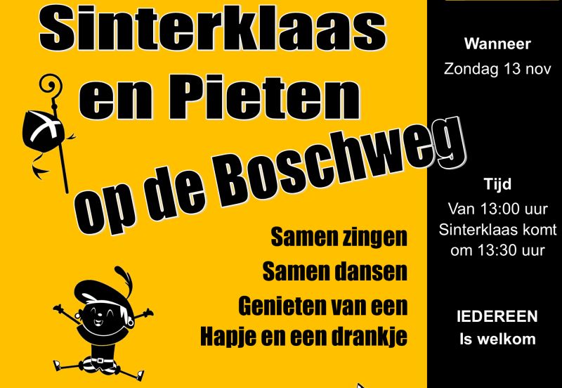Schijndel - Op zondag 13 november komt sinterklaas met zijn pieten naar de Boschweg om daar een gezellige middag te hebben samen met alle kinderen en hun ouders/verzorgers. Vanaf 13.00 uur is er muziek op de Boschweg. Rond 13.30 uur worden Sinterklaas en zijn pieten verwacht.