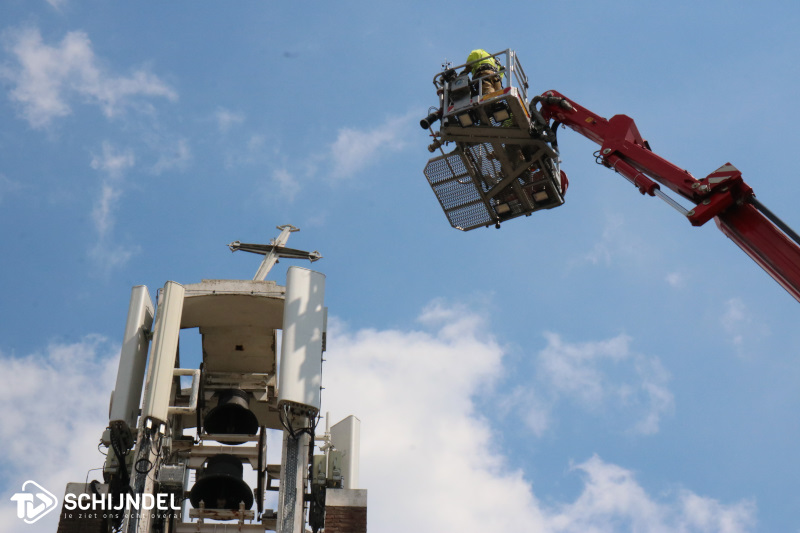 Schijndel - De brandweer van Veghel werd vanmiddag opgeroepen bij de kerktoren in de Julianastraat voor assistentie van de politie. Ter plekke bleek het kruis op de kerktoren scheef te staan. Twee politievoertuigen kwamen ter plekke en de hoogwerker van Veghel werd opgeroepen. De brandweer heeft het kruis gecontroleerd en heeft geconstateerd dat het stevig staat. Ook hebben de brandweerlieden foto's gemaakt en in overleg met de politie is besloten er verder niets mee te doen. De gemeente zal door de wijkagent in kennis gesteld worden. Het bleef even onduidelijk hoe het kruis zo scheef kon komen te staan maar kort voor de brandweer retour Veghel ging kwam een man aangelopen met meer informatie. Eerder deze week zou het kruis op de toren geraakt zijn tijdens andere werkzaamheden. Enkele foto's en een korte video onder 'lees meer'.