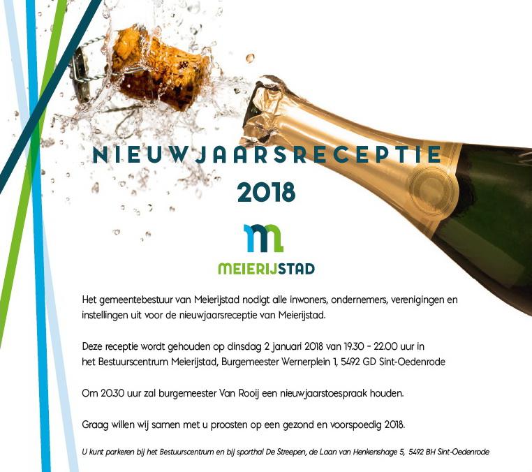 Meierijstad - Het gemeentebestuur van Meierijstad nodigt alle inwoners, ondernemers, verenigingen en instellingen van harte uit voor de nieuwjaarsreceptie van Meierijstad. Deze receptie wordt gehouden op dinsdag 2 januari 2018 van 19.30 tot 22.00 uur in het Bestuurscentrum Meierijstad aan het Burgemeester Wernerplein 1 in Sint-Oedenrode. Om 20.30 uur houdt onze nieuwe burgemeester Kees van Rooij zijn eerste nieuwjaarstoespraak. Alle aanwezigen kunnen samen proosten op een gezond en voorspoedig 2018.![]() |