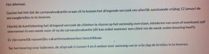 Geen onbekende over de vloer Hart voor Schijndel gaat er vanuit haar kennis hierover vanuit dat er in de regio weinig cliënten worden gestimuleerd om af te zien van vervanging. Dat gebeurt wel bij Laverhof. Als een hulp vakantie heeft, wordt aan de cliënt gevraagd of vervanging gewenst is. "Navraag bij Laverhof leert ons dat dit zou gebeuren omdat veel, vaak oudere, cliënten liever geen onbekende over de vloer willen. Daar valt wat voor te zeggen", aldus Hart voor Schijndel. Hart ontvangt echter al maandenlang berichten dat Laverhof een forse stap verder gaat. Tijdens werkoverleggen wordt de hulpen op het hart gedrukt er bij cliënten op aan te sturen dat ze afzien van vervanging, zo vernamen we. Gisteren kreeg Hart voor het eerst bewijs in de vorm van een foto van een elektronisch bericht, geplaatst op het intranet van Laverhof (zie afbeelding). Hart voor Schijndel: "Wat het extra pijnlijk maakt is dat Laverhof vorig jaar extra geld vroeg vanwege tekorten in 2015 en dat naar verwachting dit jaar weer om een extra bijdrage wordt gevraagd, dit keer vanwege vermeende tekorten in 2017."