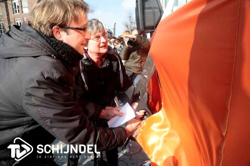 Schijndel - Tientallen mensen stonden vanochtend tegen 12 uur in de kou te wachten op de Hoofdstraat. De pop-op bibliotheek zou om 12 uur officieel geopend worden door wethouder Menno Roozendaal. De wethouder zette 1 minuut over 12 zijn fiets in het fietsenrek op slot. Hij hield zijn toespraak kort, en knipte samen met dorpsschrijver Gerda Baeyens het grote oranje lint door. Hiermee was de officiële openingshandeling verricht en kon het publiek snel naar binnen waar warme koffie en - even later - warme worstenbroodjes stonden te wachten. In het fotoboekeen sfeerimpressie van de openingshandeling en van het interieur van de bibliotheek. Onder 'lees meer' is in een korte video de speech terug te zien van de wethouder evenals de openingshandeling.