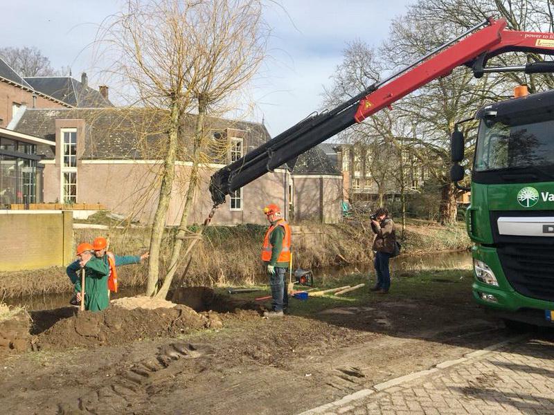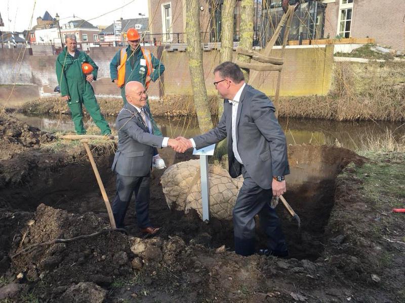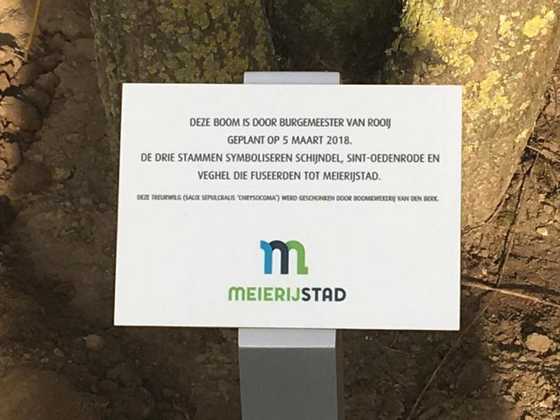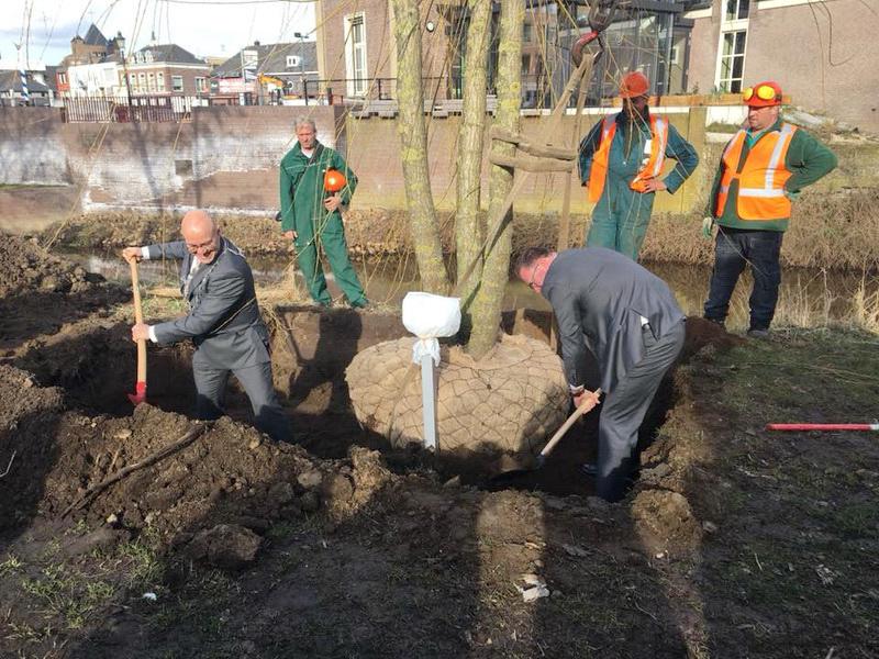 Meierijstad/Veghel - Burgemeester Kees van Rooij van de gemeente Meierijstad plantte gisterenmiddag maandag 6 maart de eerder aangekondigde driestammige treurwilg (Salix sepulcralis Chrysocoma). De drie stammen symboliseren de voormalige gemeenten Schijndel, Sint-Oedenrode en Veghel en staat symbool voor de fusie tot Meierijstad. De boom heeft een plaatsje gekregen in het Julianapark in Veghel. Deze boom werd geschonken door Van den Berk Boomkwekerijen uit Sint-Oedenrode aan de gemeente Meierijstad. Foto: Burgemeester Van Rooij bedekt samen met directeur Pieter van den Berk (Boomkwekerij van den Berk) als eerste de grote boomkluit. Foto's ontvangen van Meierijstad