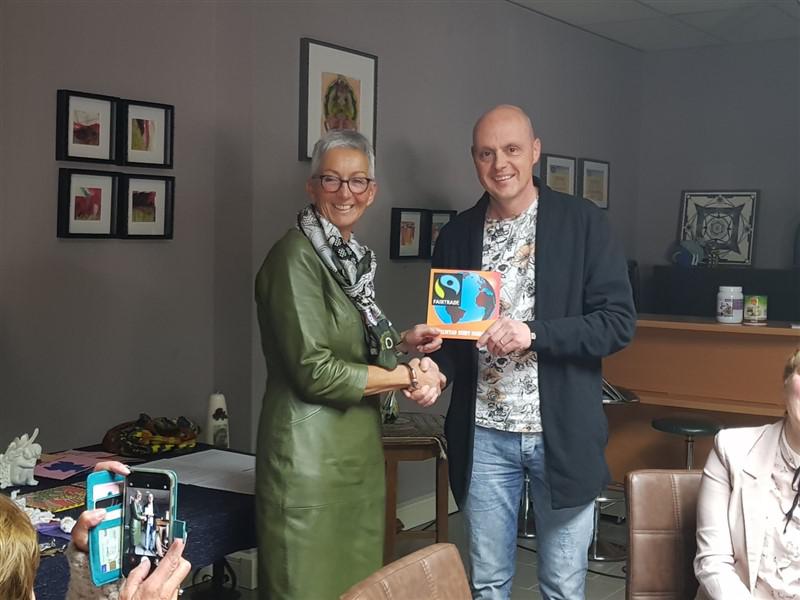 Voor de stichting Faire Trade Meierijstad i.o. was dit een mooie aangelegenheid om waardering uit te spreken voor de maatschappelijke inzet van Anja. Naast haar persoonlijke inzet in Zuid-Afrika draagt zij extra bij door bij creatie-f-lokaal Fair Trade koffie en thee te schenken. Op de foto neemt Anja van de Zand een Fair Trade bordje in ontvangst uit handen van de voorzitter Fair Trade Meierijstad i.o., Arthur Rijken.