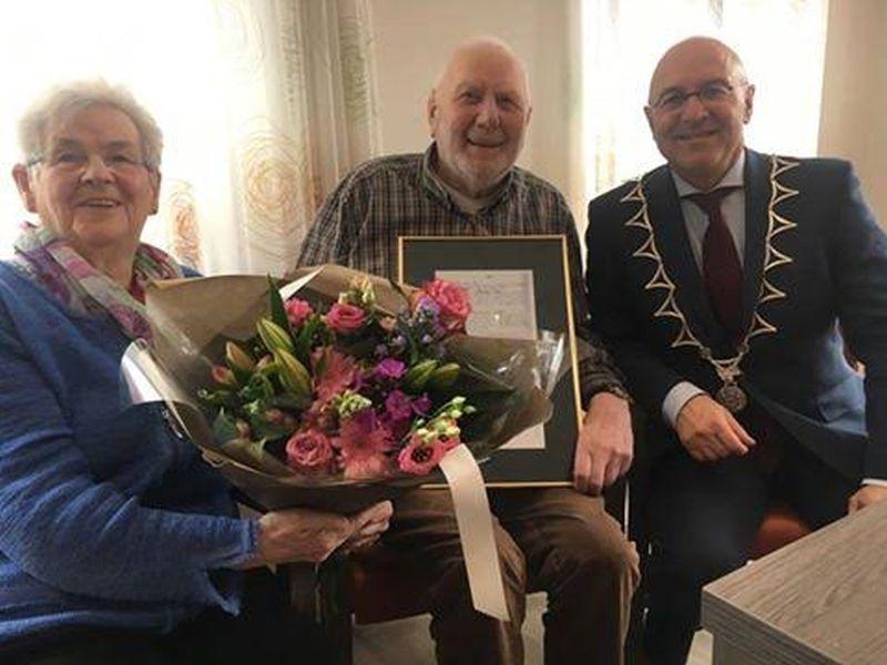 Schijndel - Burgemeester Van Rooij bracht een bezoek aan de heer en mevrouw Rijploeg-Hazekamp uit Schijndel die maar liefst hun 65-jarig huwelijk mochten vieren. Zij mogen zich dus nu een 'briljanten paar' noemen. Vanwege gezondheidsklachten werd het feest gevierd in besloten kring. TVSchijndel wenst hen nog vele gelukkige jaren toe. Bron: tekst en foto Meierijstad |