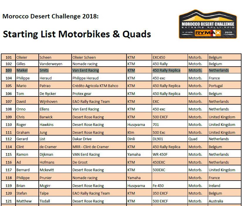 Maikel Smits, beste Nederlander in de Dakar 2018 wordt Rymax-rider Het was één van de zwaarste Dakars sinds jaren, maar dat weerhield Maikel Smits er niet van de finish te halen. En met een 26e plaats in het algemene klassement leverde hij als debutant een zeer knappe prestatie, in een sterk bezet veld met alle wereldtoppers van de partij. Deze mooie prestatie ging niet onopgemerkt voorbij aan MDC hoofdsponsor Rymax Lubricants, die Smits uitnodigde om in de tiende editie van de MDC van start te gaan. In de kleuren van Rymax zal Maikel voor een topklassering gaan. Marokko is geen onbekend terrein voor Smits. In 2017 finishte hij op een fraaie 15de plaats in de Merzouga Rally. Tijdens de MDC zal Smits er een tandje bij moeten zetten om het nog beter te doen, maar het belooft een mooie strijd te gaan worden bij de motoren.