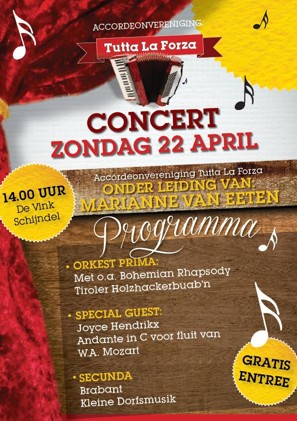 Schijndel - Accordeonvereniging Tutta La Forza uit Schijndel liet afgelopen zondagmiddag 22 april in De Vink horen hoe veelzijdig accordeonmuziek kan zijn. Tutta La Forza betekent met volle kracht en zo werd er ook gespeeld tijdens dit gratis concert. De dirigente Marianne van Eeten bracht haar enthousiasme over op zowel de orkestleden als het publiek. Het orkest Prima startte met een swingend nummer van de Beatles, When I'm Sixty-Four. Bij de Bohemian Rapsody maakten de vijf verschillende partijen in het orkest de melodie heel herkenbaar voor het publiek. Natuurlijk speelde het accordeonorkest ook een tango met verve, Tango d'Amour. Dichter bij huis was het nummer van Guus Meeuwis 'Het is een nacht'.