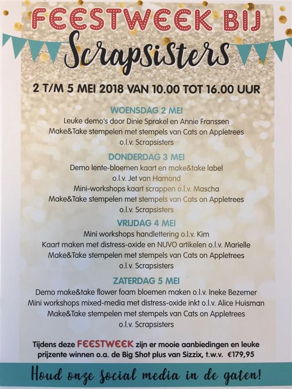 Schijndel - Donderdag 3 mei bestaat hobbyspeciaalzaak ScrapSisters één jaar. Dit wordt gevierd van woensdag 2 tot en met zaterdag 5 mei. Monique en Anja hebben een gevarieerd programma samengesteld, zoals make&take miniworkshops, demo’s etc. U kunt profiteren van diverse aanbiedingen en prijzen winnen. Op de website van ScapSisters en onder ‘lees meer’ vindt u een overzicht de verschillende activiteiten. Woensdag 2 mei Demo door Dinie Sprakel en Annie Franssen. Make&take met de stempels van Cats on Appletrees