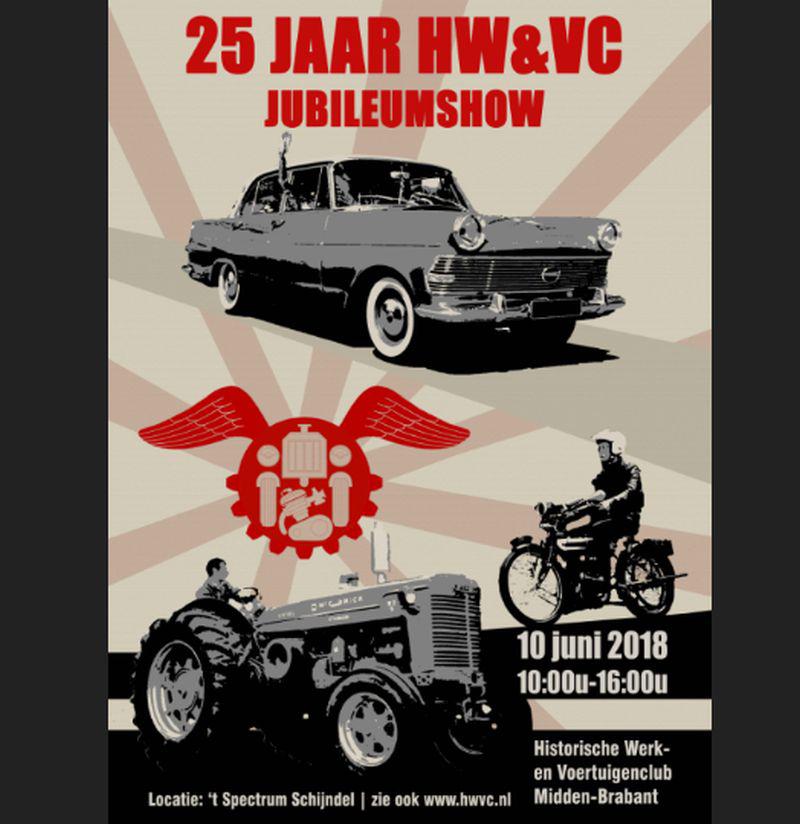 Het 25-jarig jubileum wordt op zondag 10 juni gevierd met een jubileumshow. Tussen 10:00u en 16:00u bent u welkom bij 't Spectrum in Schijndel. Het thema van de show is 'voor en door leden'. Dit wil zeggen dat de leden van HW&VC u hun meest begeerlijke of bijzondere verzamelstukken zullen laten zien. Zoals eerder vermeld hebben de leden verschillende voertuigen en werktuigen, u kunt dus ook en gevarieerd aanbod aan oldtimers verwachten.