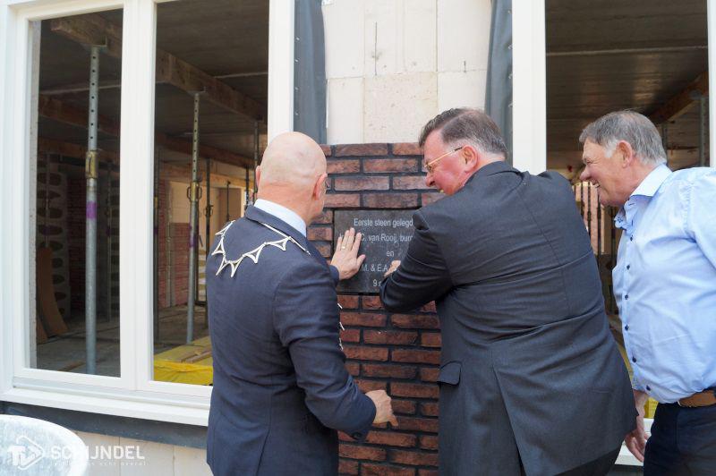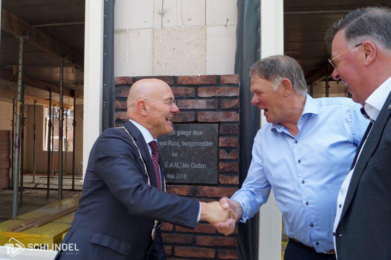 Schijndel - Woensdag werd de eerste steen gelegd bij wooncomplex Het Anker. Burgemeester Kees van Rooij kwam hiervoor naar Schijndel. Hij voerde de handeling uit samen met de gebroeders Den Ouden. De toekomstige bewoners van het nieuwbouwcomplex waren hierbij ook aanwezig want alle vijftien appartementen zijn al verkocht. Twaalf van deze woningen komen in een nieuw complex op de locatie waar voorheen de apotheek zat. De drie andere appartementen komen in het aangrenzende gebouw Hermétage. Na de steenlegging gingen alle aanwezigen naar Noot om daar met z'n allen nog even het glas te heffen op de nieuwbouw. Het Anker is volgens planning eind 2018 klaar. In ons fotoboek vindt u wat foto's van de steenlegging.