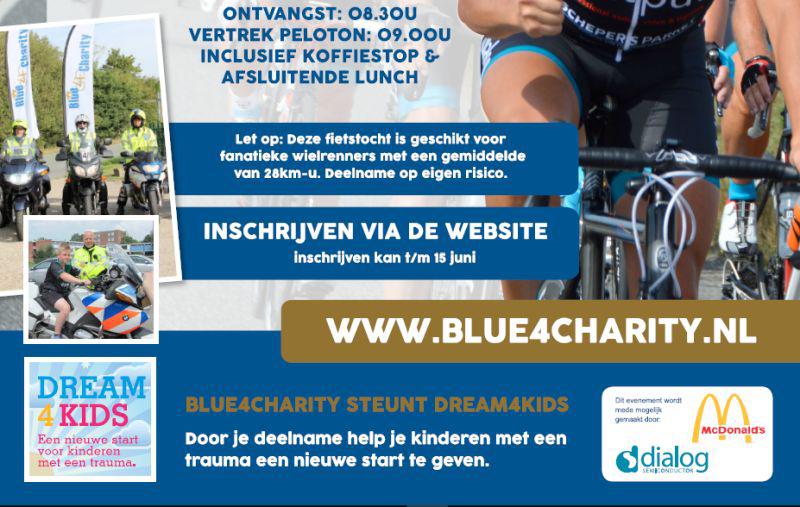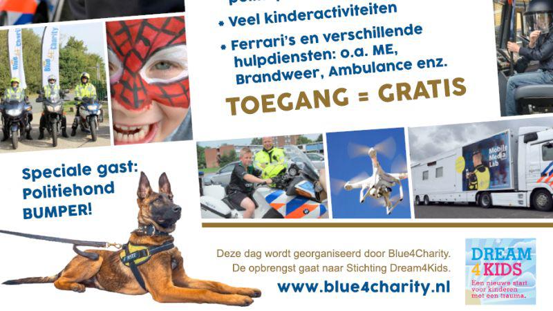 Schijndel - Op 9 juni aanstaande organiseert B4C een open-dag nabij het politiebureau in Schijndel. Naast de hulpdiensten zoals Brandweer, Ambulance en uiteraard de verschillende politieonderdelen en voertuigen, zullen er tal van activiteiten plaatsvinden die uiteindelijk geld in het laatje brengen voor het goede doel. Zo is er o.a. een loterij, een veiling, een VeilingWall en een spelcircuit voor kinderen met altijd prijs. Er komen echte Ferrari’s, De Mobiel Media-Trailer van de politie, een simulator van Veilig Verkeer Nederland en nog veel meer. Er zijn demonstraties op het demoveld en ook Nederlands bekendste Politiehond Bumper met zijn begeleider Stephan maken hun opwachting. Bumper heeft meer dan 90.000 volgers op Facebook en veel kinderen en volwassenen kennen deze viervoeter in opleiding. Er komt zelfs een boek uit over Bumper. En ja, in dat boek staat ook B4C vermeld. Er is een bijzondere band tussen Bumper en de organisatie van B4C. Op 9 juni aan de Kerkendijk in Schijndel start dit evenement om 11.00 uur en het duurt tot 17.00 uur. Een terras met muziek ontbreekt uiteraard ook niet. Meer informatie vindt u op de website van B4C www.blue4charity.nl of op de Facebookpagina van B4C. U komt toch ook!Begin september fietst Blue4Charity (B4C) van München naar ’s-Hertogenbosch. Een tocht van ruim 1000 kilometer in 6 dagen. Ruim 30 renners en zo’n 26 begeleiders (motards, masseurs, verzorgers enz.) Dit allemaal voor het goede doel: Dream4Kids. Een organisatie die mooie droomdagen organiseert voor kinderen met een traumatische ervaring. Als iemand weet hoe dat kan ontstaan, zijn het wel politiemensen, die regelmatig door hun werk hiermee in aanraking komen. B4C bestaat uit die politiemensen werkzaam in de regio Oost-Brabant. Sinds het ontstaan in 2003 (naar aanleiding van het overlijden van een collega, organiseert B4C met regelmaat fietstochten en evenementen voor het goede doel.) Zo hebben het KWF, Villa Pardoes, KiKa en Make a Wish al mogen ervaren wat B4C d.m.v. van allerlei evenementen bij elkaar sprokkelt voor het goede doel. Deze keer is het goede doel dus Dream4Kids een kleine organisatie uit Rosmalen, die enorm goed werk verricht. In aanloop naar die tocht worden er fietstochten georganiseerd die onder begeleiding van politiemotoren non-stop door Brabant gaan. Daarnaast ook een Open-dag voor iedereen!