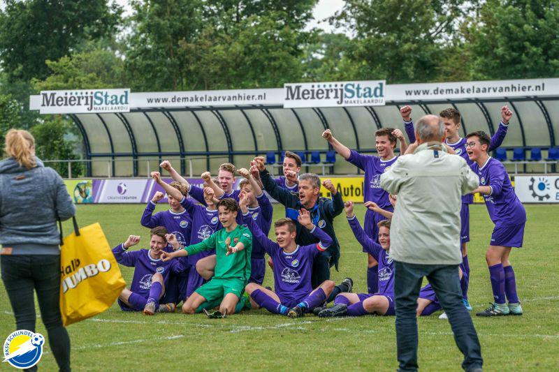 De voorhoede bestaande uit Bart, Finn, Jonas, Niek en Mees moesten dus weer vol aan de bak. Vanuit het middenveld bestaande uit Thijs, Winand en Timo kregen ze veel ballen. Na 2 keer de lat en 1 keer de paal, kreeg Niek de bal in de laatste minuut en scoorde 3-2. Het was een leuke maar vooral spannende wedstrijd. Hierna heeft het team het kampioenschap gevierd en met de platte kar zijn ze door het centrum gegaan. Bron: Tekst en foto Schijndel/De Wit