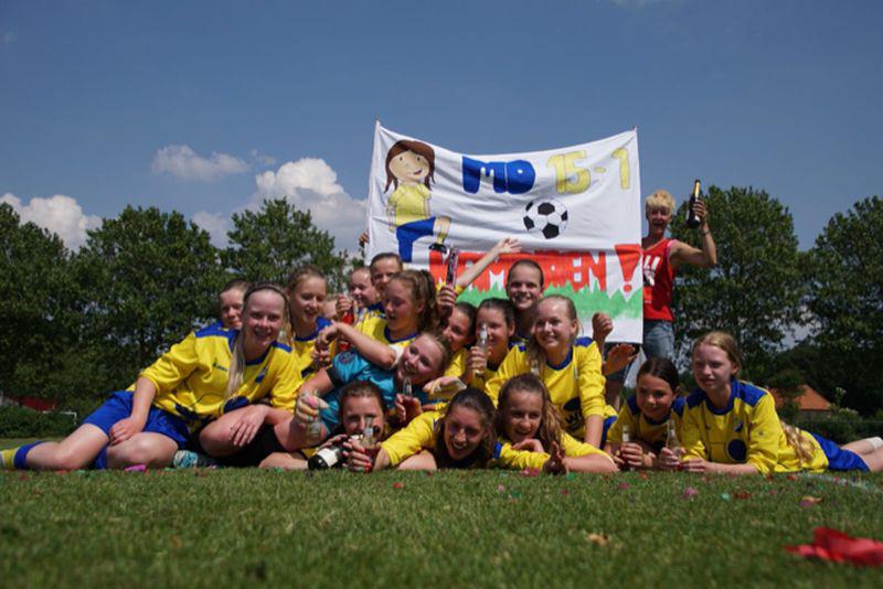 Schijndel - Er klonk gelach en gejubel. Gisteren 26 mei was de kampioens wedstrijd van MO15-1 van R.K.S.V.Schijndel/de Wit tegen Rhode. Schijndel moest 1 punt halen om kampioen te worden. Gespannen koppies kwamen het kleedlokaal uit. Het veld was omringt met vele toeschouwers. Het fluitsignaal gaat. Schijndel gooit er meteen veel druk op en neemt algauw de overhand. Een paar pogingen op doel volgen maar de keepster van Rhode is er snel bij. In de 10e minuut scoort Schijndel na een mooi samenspel de eerste goal. De 2e volgt snel. Rhode blijft flink verzet bieden en krijgt een paar keer de kans om dicht bij het Schijndelse doel te komen. Na 20 minuten is er een waterpauze, met een dikke 30 graden was dat wel nodig. Ruststand 2-0. Eindstand werd 8-1.