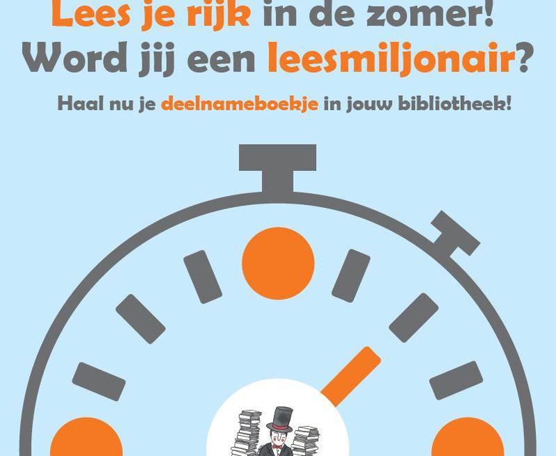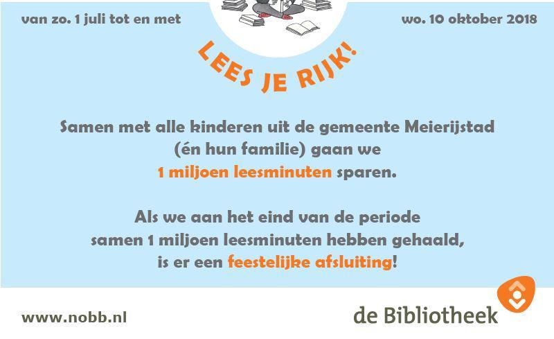 Meierijstad - Word ook een Leesmiljonair en verdien een ticket voor het feest! Uit onderzoek is gebleken dat kinderen die in de zomervakantie niet lezen, soms wel één of twee niveaus terugvallen in hun leesontwikkeling. Dat wordt de zomerdip genoemd. Om de zomerdip tegen te gaan, starten de bibliotheken in Meierijstad op 1 juli weer met het project ‘Leesmiljonairs’. Alle deelnemers samen gaan proberen een miljoen minuten te lezen. Leesmiljonairs kunnen in de bibliotheek een speciaal boekje ophalen waarin ze per week opschrijven hoeveel minuten ze gelezen hebben. Het zelf lezen thuis, maar ook voorlezen en het bezoeken van de bibliotheek tellen mee. Kinderen verdienen met hun leesminuten bronzen, zilveren en gouden diploma’s en cadeautjes. Zo’n diploma is bovendien het ticket voor het Leesmiljonairsfeest in de Kinderboekenweek, op vrijdag 12 oktober. Zo lees je je rijk!