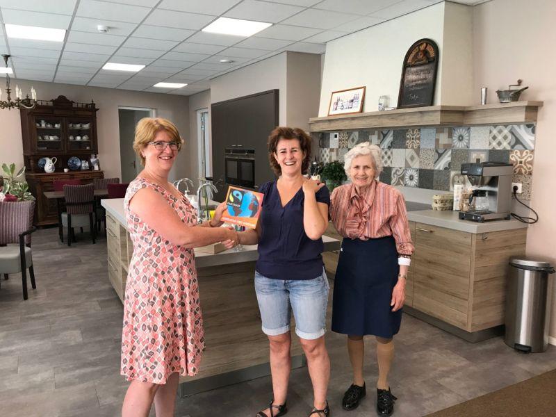 Schijndel - Anne-Marie Looman van Het Andere Wonen Schijndel neemt een fairtrade vignet in ontvangst. Rian van der Sman van de werkgroep Fairtrade Schijndel is verheugd deze erkenning uit te kunnen reiken. In het gebouw van Het Andere Wonen worden 16 volwaardige appartementen verhuurd die met hun achterdeur grenzen aan een gezamenlijke ruimten en een binnentuin. Het zijn compleet zelfstandige appartementen waar mensen met dementie met hun partner kunnen verblijven. Anne-Marie geeft aan dat de sfeer goed moet zijn, men moet zich echt thuis kunnen voelen. Het leven, zoals men dat kende, wordt ondersteund. Tijdens een korte rondleiding proef je echt dat er een huiselijke sfeer is. Met behulp van een kunstenaar is gepoogd de juiste sfeer en beleving aan ruimten en de brede gangen te geven. Er is zelfs een kleine werkplaats ingericht voor 1 van de bewoners die nog graag wat timmert. Foto Rian van der Sman, Anne-Marie Looman en 1 van de bewoonsters voor de keuken van Het Andere Wonen. Bron: tekst en foto fairtrade Schijndel