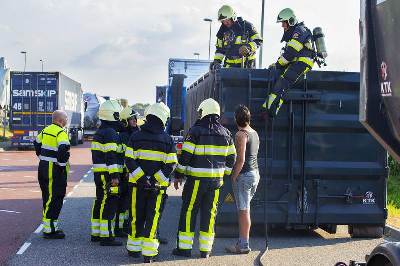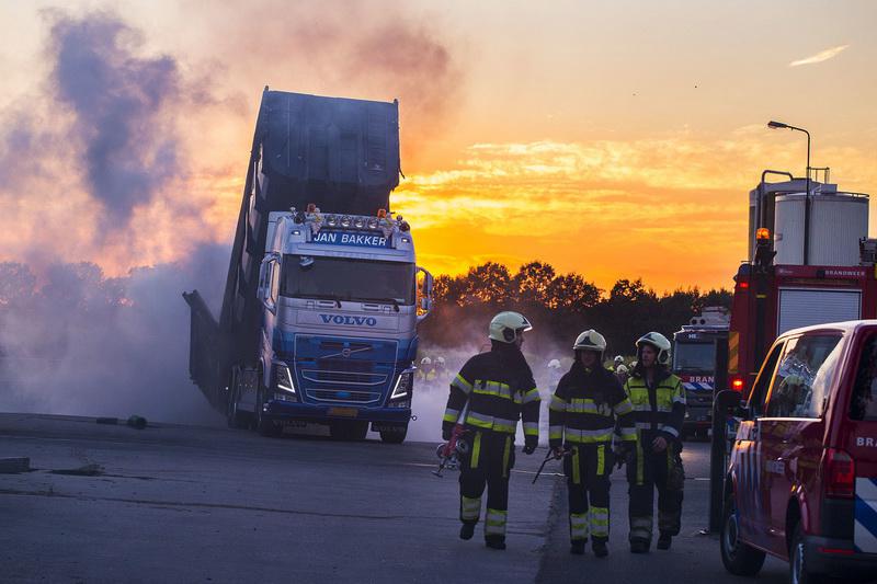Son en Breugel / Schijndel / Heesch - Rond 19.00 uur werd de brandweer van Sint-Oedenrode gealarmeerd voor een brandgerucht op de parkeerplaats Sonse Heide langs de snelweg A50 bij Son en Breugel. In een zogeheten containerwagen geladen met mestkorrels was broei ontstaan. Na een eerste verkenning bleek een snelle bluspoging niet toereikend en om de broei in de open container te stoppen. Hiervoor moest de container geleegd worden waarna de mest kon worden afgeblust. Foto's Sander van Gils