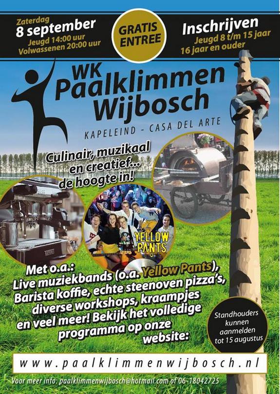 Programma WK Paalklimmen 2018 14.00 Start culinaire en creatieve markt 14.00 Optreden band noColour 14.30 Eerste jeugdklimmers van start 15.30 Tweede sessie noColour 17.00-18.00 Optreden band Yellow Pants 18.00 Prijsuitreiking jeugd Tussendoor vrij klimmen voor degene die dat willen 19.00 Tweede sessie Yellow Pants 20.00 Start volwassenen DJ met medewerking van zanger Dirk Drost 23.30 Mystery gast