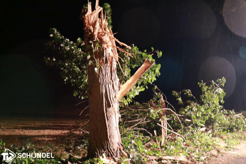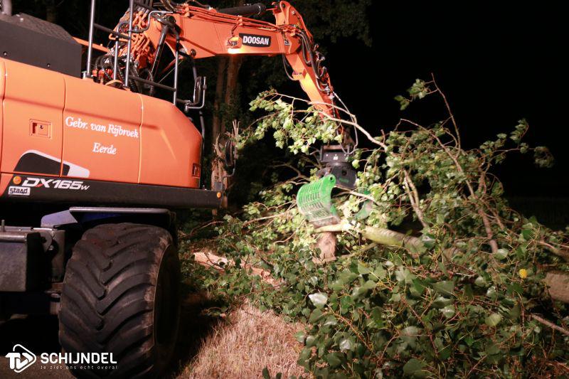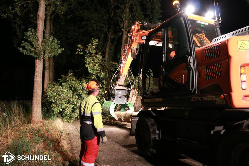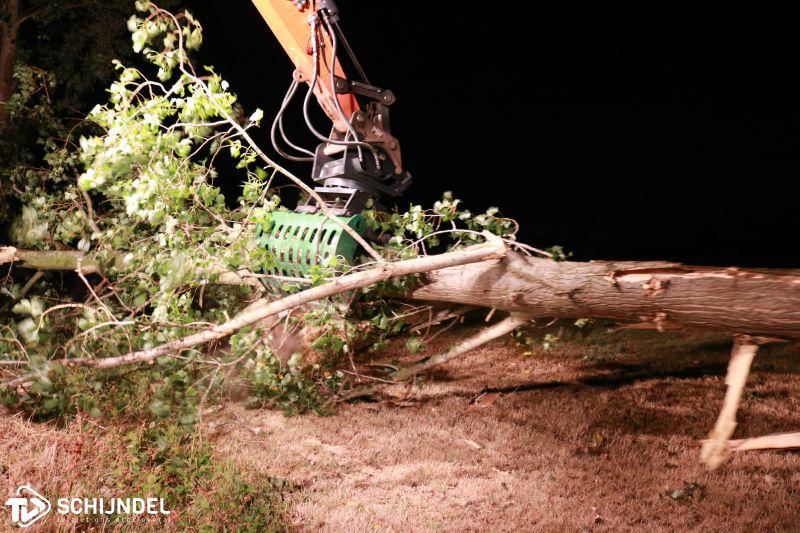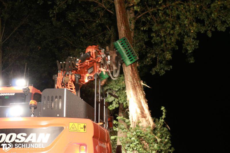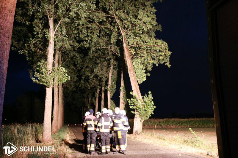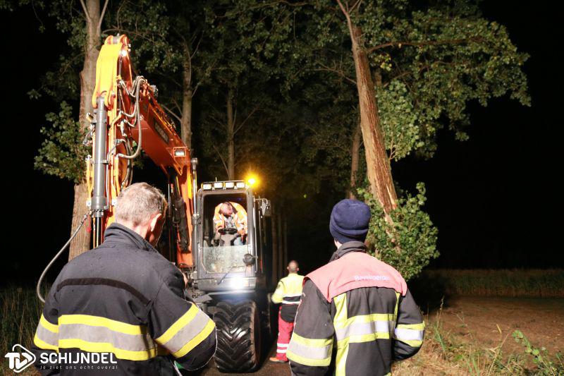 Schijndel - De brandweer van Schijndel is op donderdagavond 9 augustus enkele uren bezig geweest met een lastige klus. Op de Woudseweg was rond 21.30 uur een boom halverwege deels afgebroken en in een andere boom terechtgekomen. De weg werd direct afgezet. Er moest gewacht worden op een kraan met grijper. Omdat de eerste aanvraag niet kon, de kraan was al naar een andere calamiteit, werd gewacht op een tweede. In de tussentijd zorgde TVSchijndel voor een versnapering voor de brandweerlieden. De tweede kraan kwam uit Eerde en was uiteindelijk rond 22.45 uur ter plaatse. De bestuurder wist de boom snel neer te halen en de grote stukken te verslepen naar een naastgelegen weiland. De brandweer kon daarna de weg schoonvegen en rond 23.15 uur de weg weer vrijgeven. Enkele foto's onder 'lees meer', in de video de beelden.