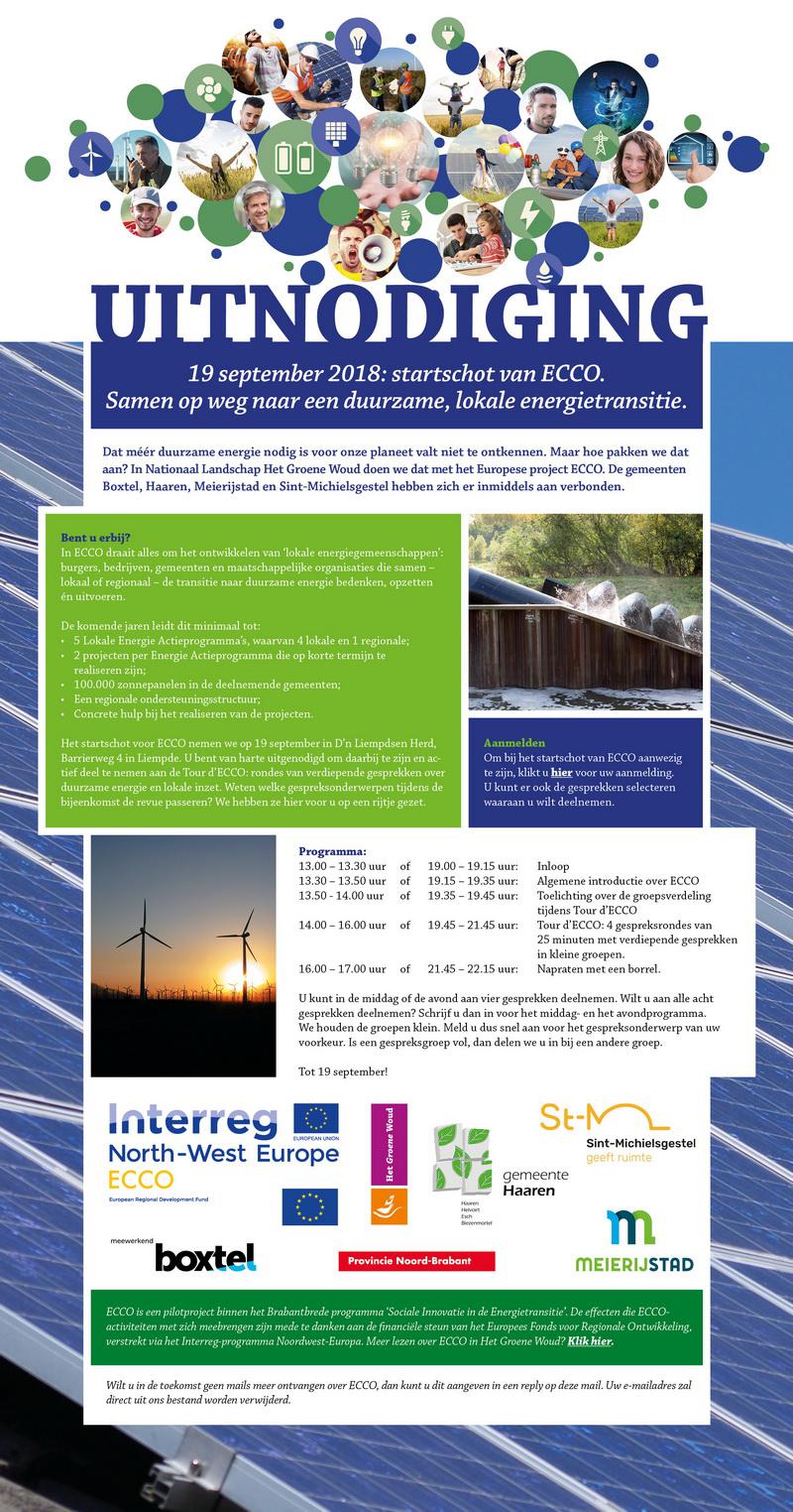ECCO is een pilotproject binnen het Brabantbrede programma 'Sociale Innovatie in de Energietransitie'. ECCO is een initiatief van Nationaal Landschap Het Groene Woud. De projecten en resultaten die lokale energiegemeenschappen boeken, worden mede mogelijk gemaakt met financiële steun van het Europees Fonds voor Regionale Ontwikkeling, verstrekt via het Interreg-programma Noordwest-Europa, de gemeenten Boxtel, Haaren, Meierijstad en Sint-Michielsgestel en provincie Noord-Brabant. Meer lezen over ECCO in Het Groene Woud? Kijk op www.eccohetgroenewoud.nl.