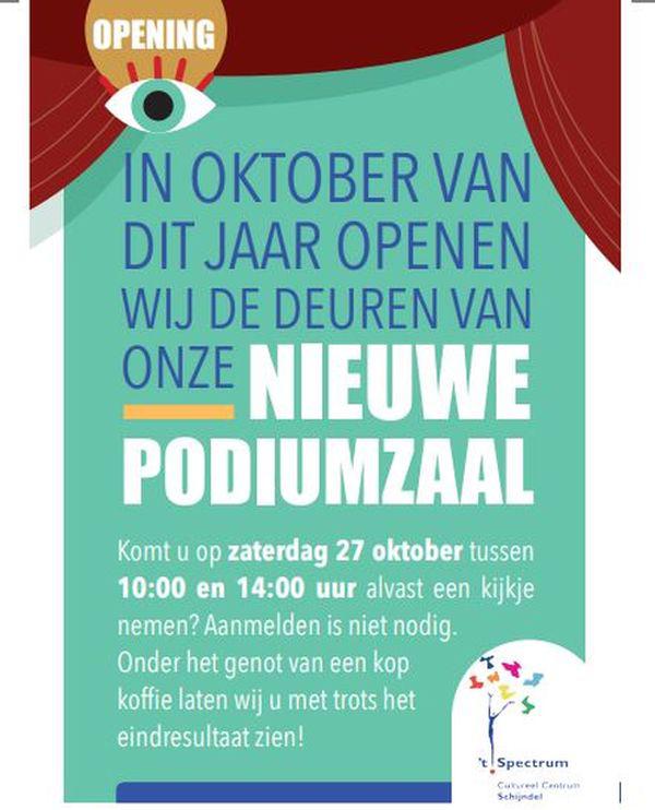 Schijndel - Na 25 jaar debat en een jaar van bouwen is het dan eindelijk zover. De podiumaccommodatie voor Schijndel is voltooid. Iedereen wordt van harte uitgenodigd een kijkje te nemen op zaterdag 27 oktober aanstaande in 't Spectrum Steeg 9 in Schijndel. Van 10.00 tot 14.00 worden alle deuren open gezet om u persoonlijk rond te leiden en vragen te beantwoorden. Aanmelden is niet nodig en onder het genot van een kopje koffie laten betrokkenen met trots het eindresultaat zien.