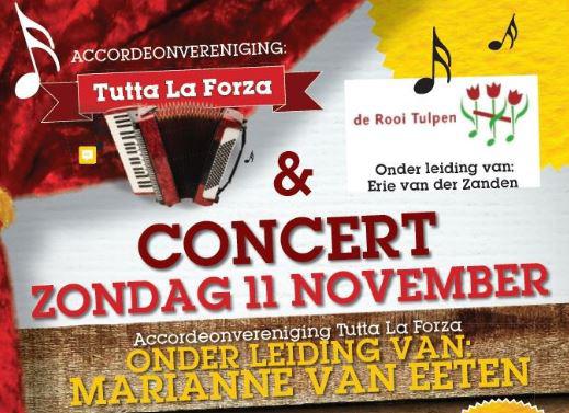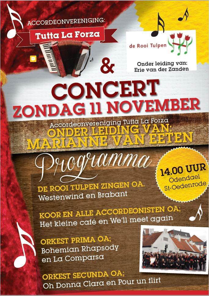 Sint Oedenrode - Beide orkesten van Accordeonvereniging Tutta La Forza uit Schijndel geven zondagmiddag 11 november samen met het koor De Rooi Tulpen uit Rooi (Sint-Oedenrode) een afwisselend concert in de grote zaal in Odendael te Sint-Oedenrode. Het programma is gevarieerd en er is voor iedereen bekende muziek. De accordeonisten van Tutta La Forza, onder leiding van dirigente Marianne van Eeten, begeleiden De Rooi Tulpen bijvoorbeeld bij ‘Het Kleine Café aan de Haven’ en ‘We’ll Meet Again’ (Vera Lynn).