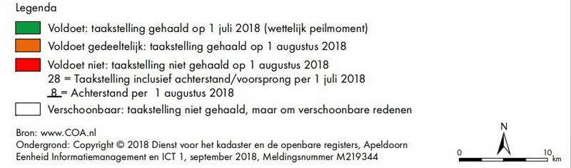 Toezichtsbevindingen: groen De taakstelling voor het eerste halfjaar van 2018 voor uw gemeente bedroeg 60 te huisvesten vergunninghouders. Aanvankelijk had uw gemeente volgens de COA-cijfers op 1 januari jl. een achterstand van 33 te huisvesten vergunninghouders. Het COA heeft echter op 1 juli jl. een correctie per 1 januari 2018 doorgevoerd. Daardoor is er een nieuwe situatie ontstaan. De gemeente Meierijstad blijkt per 1 januari 2018 een voorsprong te hebben van 28 gehuisveste vergunninghouders. Hierover heeft intensief overleg plaatsgevonden tussen het COA en de interbestuurlijk toezichthouder. Gezien genoemde correctie diende de gemeente Meierijstad in de eerste helft van 2018 aan 32 vergunninghouders huisvesting te bieden. Op grond van de realisatiecijfers van het COA per 1 juli 2018 (peildatum) constateert de provincie dat u in het eerste halfjaar van 2018 54 vergunninghouders heeft gehuisvest. Dit betekent dat u de taakstelling voor deze periode heeft gerealiseerd. De gemeente Meierijstad krijgt de kleur 'groen' op het kaartje dat de provincie inmiddels in oktober 2018 op de website gepubliceerd heeft.