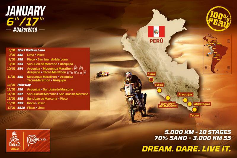 Peru De rally begint op zondag 6 januari in Lima en bestaat uit tien etappes met halverwege een rustdag. Finish is elf dagen later in Lima. Nadat Chili en Bolivia zich hadden teruggetrokken voor de Dakarrally zal deze editie zich alleen afspelen in Peru.