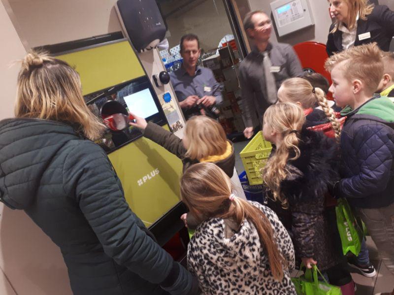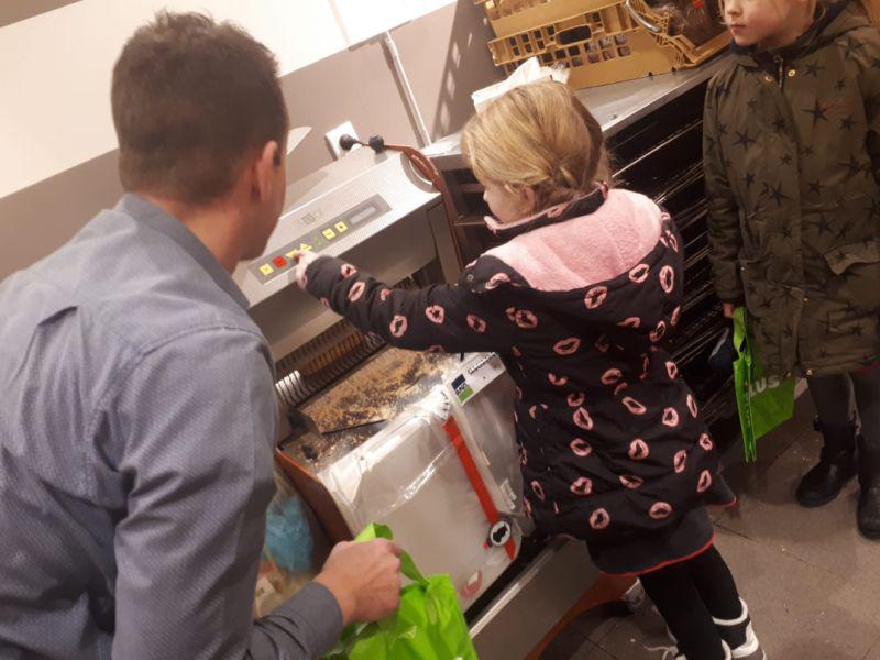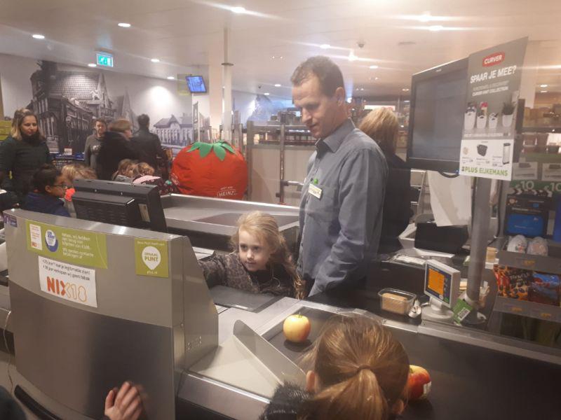 Schijndel - Alle leerlingen uit groep 3 van basisschool de Regenboog locatie Hoevenbraak kregen gisteren, 24 januari, een rondleiding in de Plus in Schijndel. Op dit moment werkt de onderbouw van deze school met het thema beroepen. Om half 1 kreeg de eerste groep een rondleiding achter de schermen en om 1 uur was de tweede groep aan de beurt. Alle 33 leerlingen kregen bij aanvang een tasje van de Plus. Zij mochten in het magazijn de koelcel en papierpers zien en in de winkel mocht elke leerling een stokbroodje snijden, een appel afwegen en alles scannen bij de kassa. Het Plus boodschappentasje, gevuld met een stokbroodje, twee boterhamworstjes en een stuk fruit mochten de leerlingen na afloop mee naar huis nemen. Alle kinderen schreeuwden vol enthousiasme 'dank je wel'. (foto's: eigen foto's TVSchijndel)