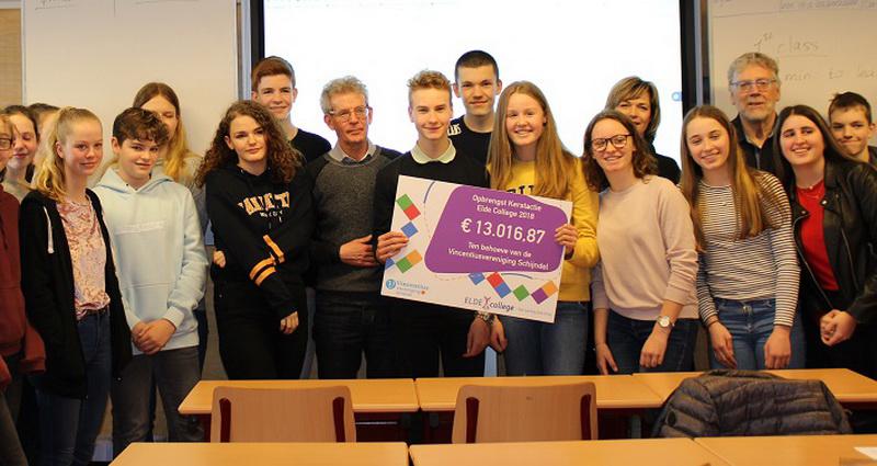 Schijndel - De jaarlijkse cheque waarvan het bedrag jaarlijks door de Kerstactie van het Elde College bij elkaar wordt gehaald is gisterenmiddag maandag 11 februari feestelijk in het Elde College uitgereikt aan de Vincentius Vereniging Schijndel. Deze kerstactie heeft jarenlang geld opgehaald voor een goed doel in het buitenland maar dit jaar heeft de leerlingenraad de Vincentius Vereniging geadviseerd als goed doel, een advies dat door het College van bestuur is overgenomen. De leerlingen van het Elde hebben dit kalenderjaar weer een topprestatie geleverd en met deze actie maar liefst 13.016,87 euro opgehaald. Klas vmbo T3b haalde het meeste geld op en mocht daardoor bij de uitreiking aanwezig zijn. De cheque werd overhandigd door de heer Dankers, voorzitter college van bestuur van het Elde College.Foto's bron Elde College