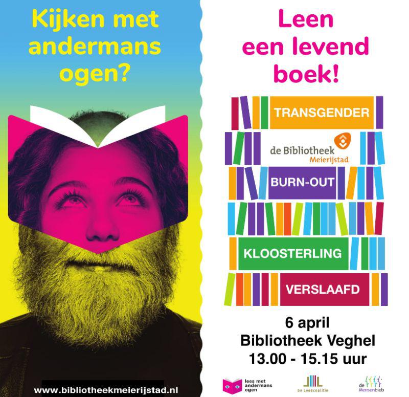 De Mensenbieb brengt mensen letterlijk met elkaar in gesprek en draagt daardoor bij aan verbinding en begrip in onze samenleving. De levende boeken kunnen voor een gesprek in de bibliotheek worden geleend bij de uitleenbalie. Op zaterdag 6 april tussen 13.00 uur en 15.15 uur vindt de Mensenbieb plaats in Bibliotheek Veghel. Iedereen is welkom om een levend boek te lenen. Een boek en een tijdstip reserveren is niet verplicht, maar kan via www.mensenbieb.nl/reserveren.
