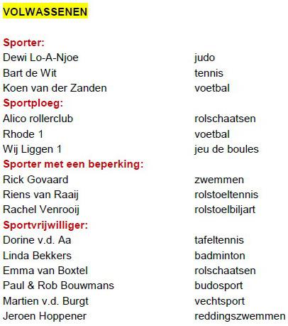 » Avond In de avond gaat het feest verder voor de volwassenen, met entertainment en huldigingen. Ook hier is Bas Muijs de presentator. De kampioenen (vanaf 18 jaar) worden gehuldigd, de Sport Awards worden uitgereikt en de winnaar van de publieksprijs wordt bekendgemaakt. De avond wordt geopend door burgemeester Van Rooij en wethouder Van der Pas reikt de prijzen uit.