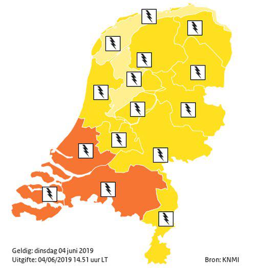 Regio - Vanavond dinsdag 4 juni trekken onweersbuien van het zuidwesten naar het noordoosten over het land. Daarbij is er kans op zeer zware windstoten van 75 tot 100 km/u en mogelijk zeer lokaal meer. Ook hagel en lokaal veel regen is mogelijk. Vanaf 18:00 uur geldt code oranje in Zeeland, Zuid-Holland en Noord-Brabant tot mogelijk 21.00 uur. Voor de overige provincies geldt voor nu code geel. Bij code oranje is grote kans op gevaarlijk of extreem weer waarbij de impact groot is en er kans is op schade, letsel of veel overlast. Dit kan heel lokaal zijn. Code oranje kan 24 uur van tevoren worden afgegeven als de kans op extreem weer 60 procent of meer is. Op knmi.nl is te zien welke waarschuwingen van kracht zijn. Bron: KNMI.