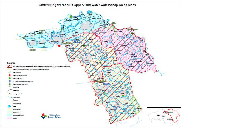 Waarom een onttrekkingsverbod? De droogte van 2018, een drogere winter en een relatief droog voorjaar leiden ertoe dat het waterschap deze maatregel moet nemen. Op dit moment is het zelfs droger dan vorig jaar om deze tijd. Met het instellen van het verbod wil het waterschap verdere daling van het waterpeil voorkomen. Door de lage waterstanden kan er schade ontstaan aan oevers en kaden en is er kans op sterfte van dieren en planten in sloten en beken. Zodra de omstandigheden dit toelaten, wordt het verbod ingetrokken. Dit maakt het waterschap bekend met een persbericht, via www.aaenmaas.nl en www.officielebekendmakingen.nl