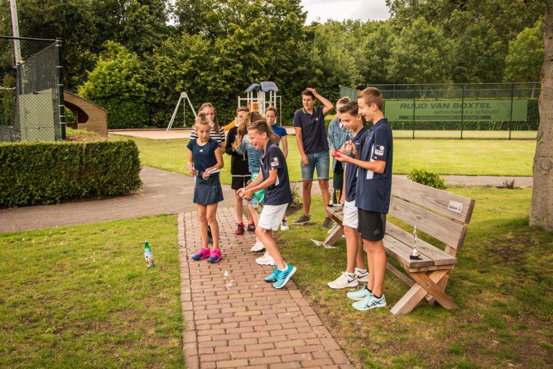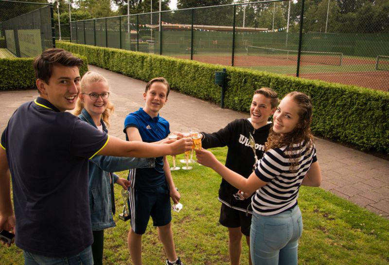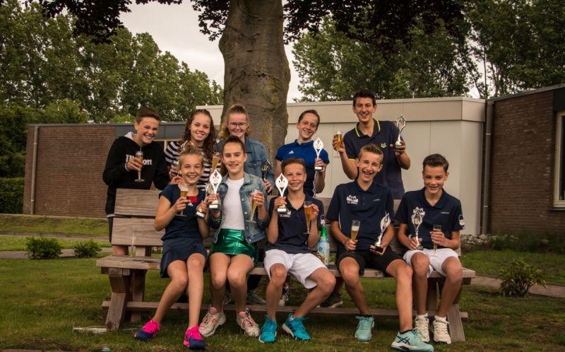 Schijndel - Teamleden Mara van den Bruggen, Nova van der Aa, Jorg van de Hurk, Sten van Uden en Kjell Russens van gemengd 10-14 jaar waren dit voorjaar ongeslagen en werden de trotse kampioenen met 42 punten na 7 wedstrijden. Ook het tweede team Gemengd 11 t/17 werd glansrijk kampioen. Lotte Voets, Isa van Alphen, Bob van Uden, Stefan Smeets en Tijn van de Akker werden ook op zondag 16 juni gehuldigd en toasten op het resultaat. Alle kampioenen ontvingen een beker met hun naam erop en een kleine attentie. De felicitaties gaan uit naar iedereen. foto's: Patricia van Doorne. |