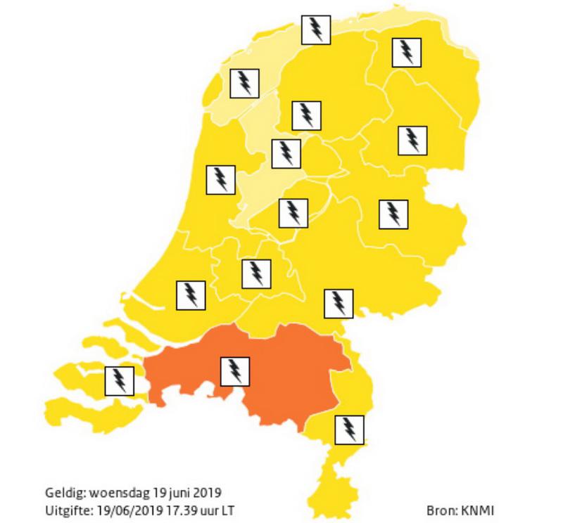 De Bilt - In Noord-Brabant komen onweersbuien voor met daarbij plaatselijk grote hagel (2-4 cm) en zware windstoten van 75-90 km/uur. Hiervoor geldt code oranje. Elders kunnen ook onweersbuien voorkomen. Deze buien kunnen vergezeld gaan van hagel en mogelijk ook windstoten tot ca. 75 km/uur. Hiervoor geldt vooralsnog code geel. Vooral landinwaarts kans op enkele onweersbuien met hagel en windstoten. Momenteel trekken stevige buien Noord-Brabant binnen en trekken de komende uren noordoostwaarts. Deze buien gaan plaatselijk gepaard met hagel en windstoten tot ca. 75 km/uur. Vooral in het zuidoosten bestaat de kans dat de buien nog zwaarder uitpakken. Landinwaarts wordt het op de meeste plaatsen zomers warm met een maximumtemperatuur die uiteenloopt van 22°C aan zee tot lokaal 28 a 29 °C in het zuidoosten. De wind is zwak tot matig uit uiteenlopende richtingen en draait in de loop van de dag naar west tot zuidwest en is zwak tot matig, langs de kust mogelijk vrij krachtig.(Bron: KNMI, 16.30 uur)