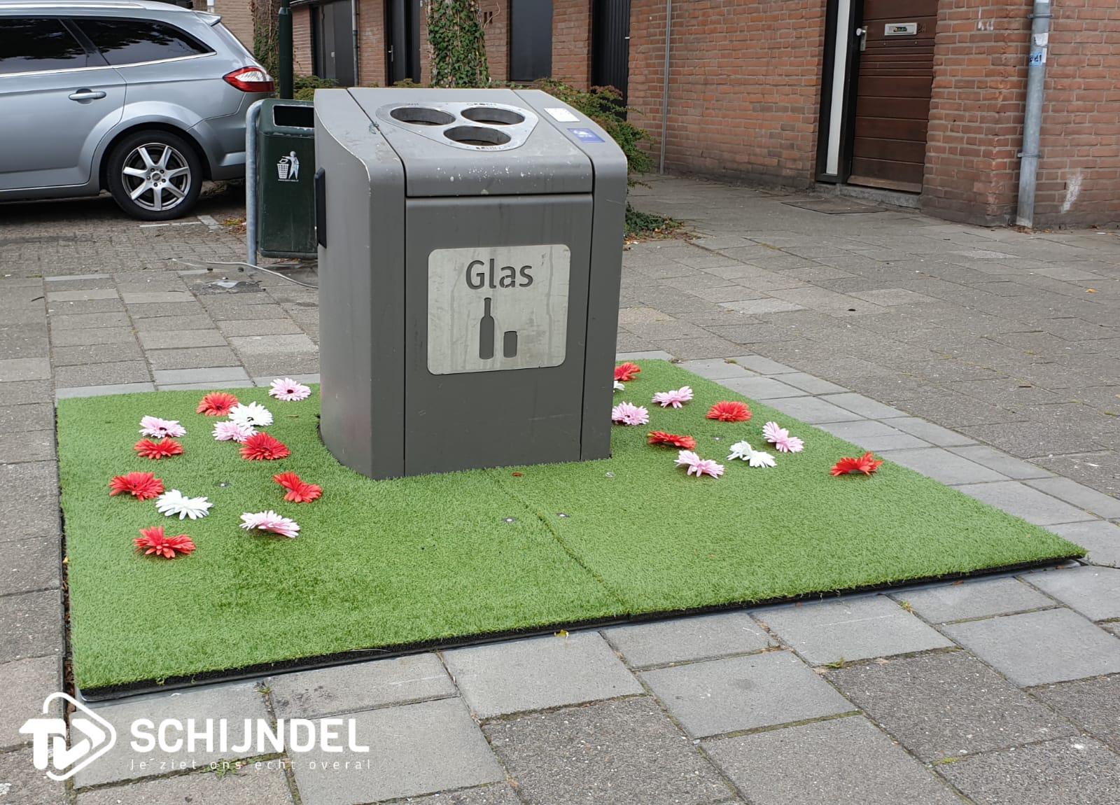 Schijndel - Vorige week vrijdag werden de eerste kunstgrasmatten met bloemstukken geplaatst bij ondergrondse containers in Veghel en aan de Papaverstraat in Schijndel. Dit om te voorkomen dat er afval gedumpt wordt. Niet snel daarna werd in Schijndel de mat weer weggehaald omdat de ondergrondse container niet geleegd zou kunnen worden. Vandaag ontving TVSchijndel een foto dat het matje weer teruggeplaatst is. Onze verslaggever besloot langs te rijden en inderdaad: de kunstgrasmat met bloemen is weer terug! De container kan na deze aanpassing waarschijnlijk wel geleegd worden omdat het ijzeren opstapje aan de voorzijde is verwijderd. Ook zitten er nu 'pluggen' in de mat zelf om deze te bevestigen aan de ondergrond.