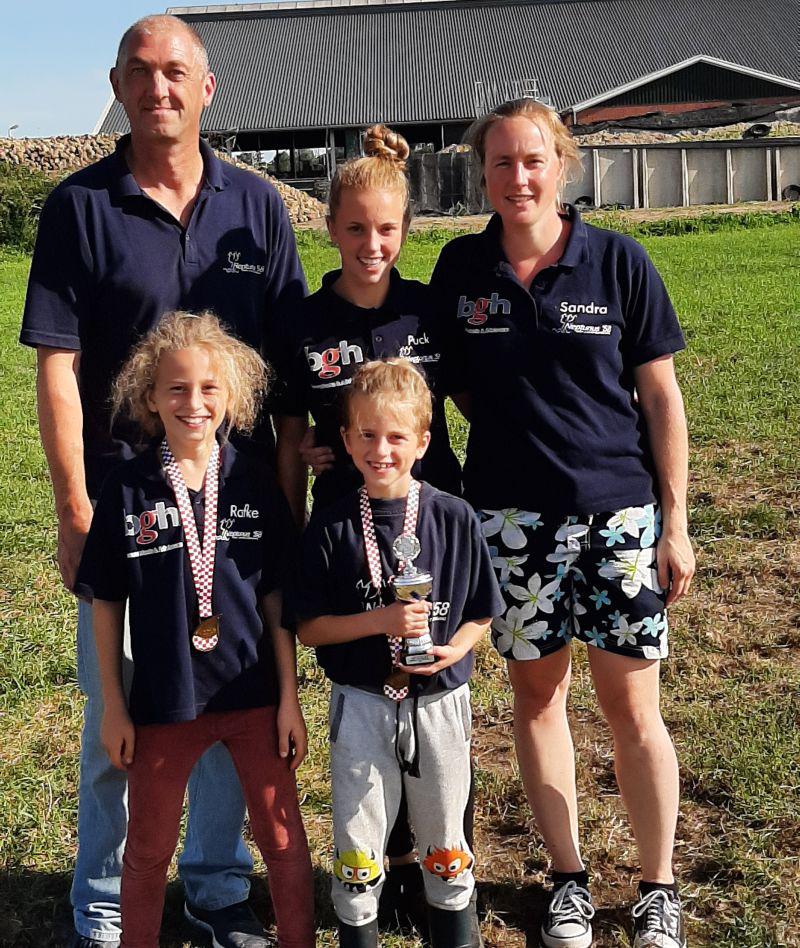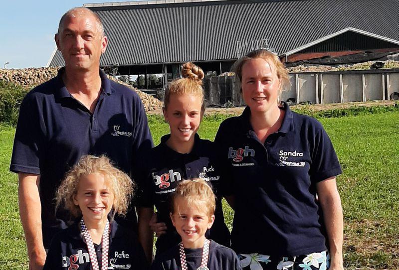 Sleeuwijk - Zaterdag 14 september hebben de open water zwemmers van Neptunus '58 hun seizoen afgesloten met de open water wedstrijd in Sleeuwijk. De zevende editie van de Biesbosch Open Water Race was zeer zonnig, alhoewel het water met 18 graden wat fris was vergeleken met de andere wedstrijden dit seizoen. Rob van de Ven mocht het spits afbijten met de kilometer schoolslag bij de masters. Hij was net binnen de 21 minuten bij de finish, en was daarmee ruim een halve minuut sneller dan zijn snelste tijd dit seizoen. Hij werd vijfde bij de masters 40-49 jaar. Vervolgens was het de beurt aan de benjamin, Thom Bakker, op de 250 vrij. Hij had het erg koud, maar zwom gestaag door en bereikte na ruim tien minuten de finish. Daarmee was hij een stuk sneller dan twee weken geleden in Vught. Hij mocht voor deze prestatie een prachtige beker in ontvangst nemen voor de derde plaats. Zus Rafke zwom de dubbele afstand en ze was ruim vier tellen sneller dan haar snelste tijd ooit. Daarmee werd ze knap zevende. Na de pauze mocht ook Puck Bakker in actie komen voor haar kilometer vrije slag. Ze behaalde een knappe zesde plaats bij de junioren. Diezelfde klassering was er even later ook voor Sandra Schellekens op haar kilometer vrij, maar dan bij de masters 30-39 jaar. Op de foto voor: Rafke en Thom. Achter Rob, Puck en Sandra.