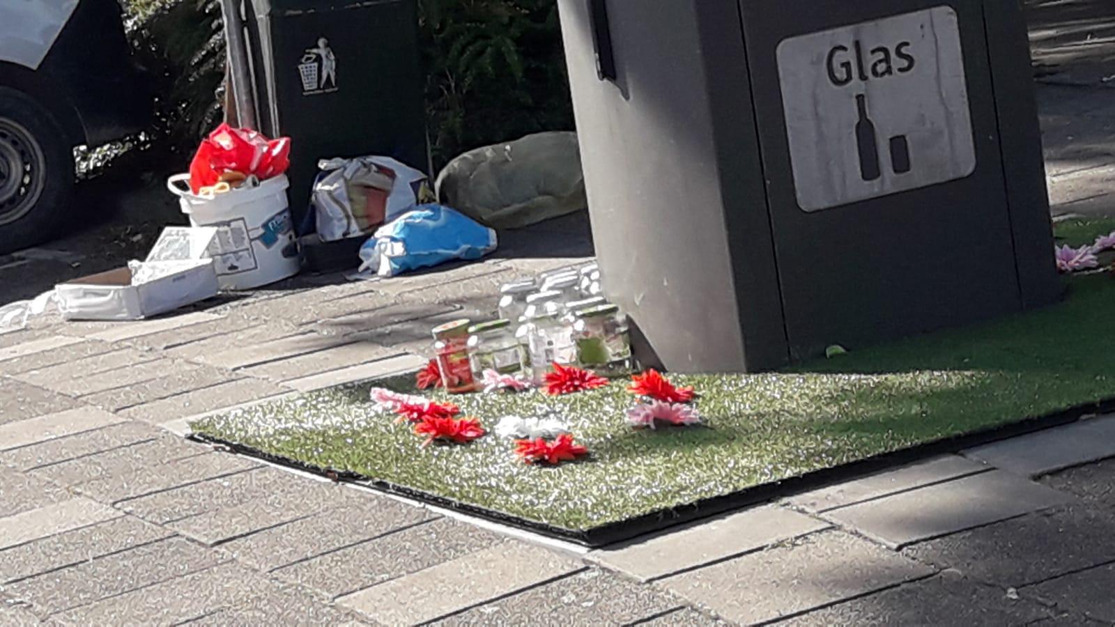 Schijndel - Gisteren ontving TVSchijndel enkele foto's van nieuwe afvaldumpingen bij de veelbesproken kunstgrasmat met bloemen aan de Papaverstraat. Er stond weer glas langs en achter de container. Vandaag is de kunstgrasmat met bloemen verwijderd. Precies 10 dagen geleden werden de eerste kunstgrasmatten met bloemstukken geplaatst bij ondergrondse containers in Veghel en aan de Papaverstraat in Schijndel. Dit om te voorkomen dat er afval gedumpt wordt. Niet snel daarna werd in Schijndel de mat weer weggehaald omdat de ondergrondse container niet geleegd zou kunnen worden. Enkele dagen later dook de kunstgrasmat weer op, met een nieuwe bevestiging. De gemeente is gevraagd om een reactie op deze nieuwe verwijdering.