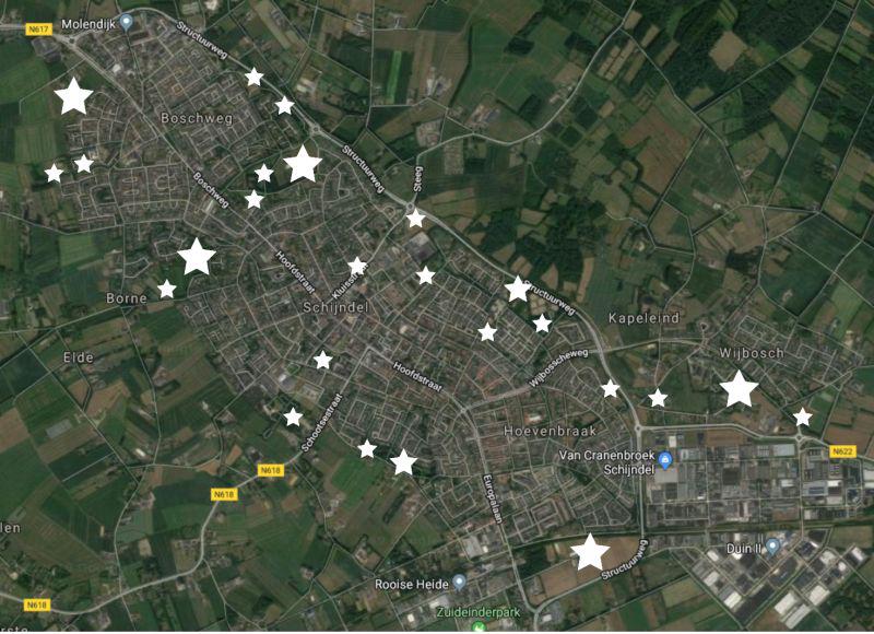 Foto: Hart Mogelijke inbreidingslocaties. Dit is nadrukkelijk niet de lijst die de gemeente nog bekend gaat maken, maar een lijst van bijna alle plekken binnen de bebouwde kom die onderzocht kunnen worden. Inclusief dus locaties met een gewaardeerde andere bestemming, zoals dierenpark, speeltuin of bosschage.