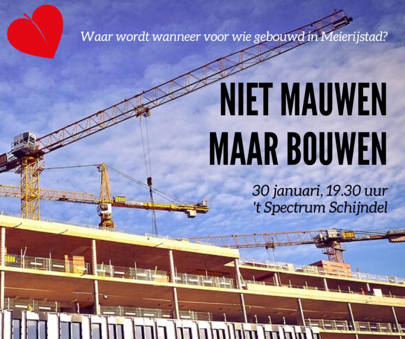 Meierijstad - Wethouder Rik Compagne , directeur Mark Wonders van Woonmeij en managers van woningcorporatie Area nemen deel aan ‘Niet mauwen maar bouwen’, de bijeenkomst die politieke partij Hart houdt over woningbouw. ‘Niet mauwen maar bouwen’ wordt donderdag 30 januari gehouden in ’t Spectrum te Schijndel. De zaal gaat om 19.30 uur open, de bijeenkomst zelf begint om 20.00 uur. Werden er in 2018 nog 670 woningen opgeleverd in Meierijstad, in 2019 waren het er nog slechts 270. Er wordt niet alleen te weinig gebouwd, de bouwplannen zijn ook nog eens te eenzijdig, er is te weinig aandacht voor het aanpassen (zoals splitsen) van bestaande bebouwing en de gemeente zelf heeft amper bouwgrond. Dat zijn zo ongeveer de belangrijkste problemen waar de gemeente momenteel mee kampt.