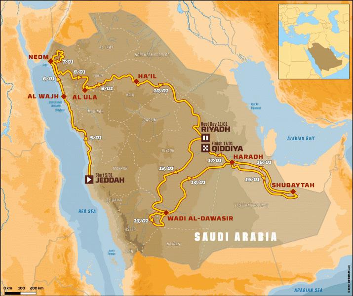 Start 5 januari De Dakar Rally begint in januari aan haar derde hoofdstuk, nadat na Afrika en Zuid-Amerika nu voor het eerst het Midden-Oosten het decor is voor de woestijnrally. In gastland Saudi-Arabië staan op 5 januari bij de start in Jeddah in totaal 557 deelnemers, verdeeld over 351 voertuigen. Het deelnemersaantal ligt daarmee iets hoger dan vorig jaar, toen er 334 voertuigen aan de start stonden in Peru. De motoren en quads tellen met een aantal van 170 het meeste aantal inschrijvingen. Bij de auto's en ssv's staan er 134 teams aan de start. Het deelnemersveld wordt compleet gemaakt door 47 trucks.
