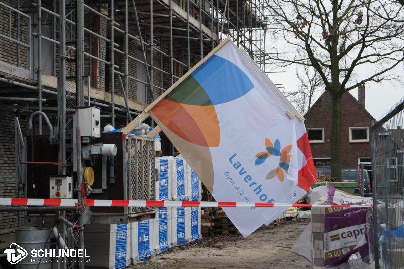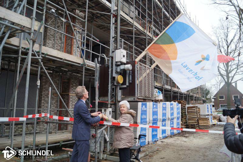 Schijndel - Vandaag is het hoogste punt bereikt van de nieuwbouw van de achtervleugel van het Mgr. Bekkershuis en daarom ging de vlag in top! Om aan de groeiende zorgbehoefte te voldoen worden hier momenteel 32 nieuwe appartementen gerealiseerd. De oplevering wordt verwacht aan het einde van het jaar. Het nieuwe gedeelte gaat 'Servaeshof' heten. Voor de naamgeving was een wedstrijd uitgeschreven. De gelukkige winnaar was Cindy van der Ven. TVSchijndel was bij het officiële moment aanwezig, hierbij mocht een van de toekomstig bewoners de knop indrukken van de bouwlift. Daarna gingen de vlaggen in top. Enkele foto's onder 'lees meer'.