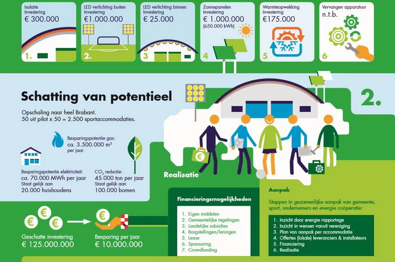 Bijdrage aan klimaatdoelstellingen Sportaccommodaties maken een belangrijk onderdeel uit van de doelstelling om de gebouwde omgeving van Brabant te verduurzamen. Er zijn ongeveer 2000 sportaccommodaties in Brabant die de komende tijd een duurzaamheidsslag kunnen maken. Bijkomend effect van het verduurzamen van sportaccommodaties is dat leden van clubs waar maatregelen worden genomen, ook eerder thuis hiermee aan de gang gaan.