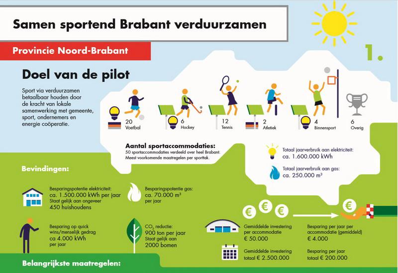 Samen sportend Brabant verduurzamen Doel van de pilot Sport via verduurzamen betaalbaar houden door de kracht van lokale samenwerking met gemeente, sport, ondernemers en energie coöperatie. Een deze 'Infographic Pilot verduurzaming samen sportend Brabant' vindt u informatie over de resultaten en bevindingen van deze proef.
